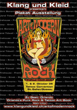 1. - 2. Oktober 2005Der Tattoo-Künstler Orlando aus Muttenz wird die Ausstellung betreuen und sein Buch Orlando’s Punk Rock & Tattoo Art Book präsentieren. Als Ehrengast wird Tätowier-Ikone Herbert Hoffmann anwesend sein! Veranstaltungsort Fürstenlandsaal Gossau Bahnhofstrasse 29 9200 Gossau Veranstalter BPA Tattoo Verein Schweiz Postfach 35 9204 Andwil Schweiz E-Mail: info@tattoo-convention-sg.ch Webseite: www.tattoo-convention-sg.ch Hauptseite | |