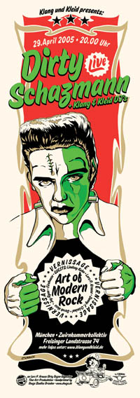 Vernissage: ZwirnkammerkollektivHandelsagentur Consumer Revolt Tibor Rumszauer Freisinger Landstrasse 74 80939 München Wegbeschreibung/Anfahrt Hotelzimmer in München Tel: 0049 (0)89 14335114 Fax: 0049 (0)89 14335116 Die Ausstellung wird anschliessend ab Montag, 2. Mai bis Samstag, 21. Mai 2005 im Zentrum der Stadt im Schallplattenladen Optimal gezeigt. Optimal Kolosseumstr. 6 80469 München Telefon: 089-268185 www.optimal-records.de Öffnungszeiten: 11.00 - 18.30 Montags, Mittwochs 11.00 - 20.00 Dienstags, Donnerstags, Freitags 11.00 - 16.00 Samstags Bei DIRTY SCHAZMANN handelt es sich um einen deutsch/spanischen Country Outlaw mit verruchter HC Vergangenheit. Der kaputte Hund, der sich regelmässig in der spanischen R'n'R Hauptstadt Madrid aufhält, hat dort Coverversionen von POISON IDEA, 9 POUND HAMMER, DEAD BOYS, DESCENDENTS, DEVIL DOGS und eine Eigenkomposition eingespielt. Die grossartig umgesetzten Akustik Nummern wurden von LAURA und MARIO AEROBITCH durch Backing Vocals und Slideguitar unterstützt. (EL RANCHO PUNCHO) Hauptseite | |
